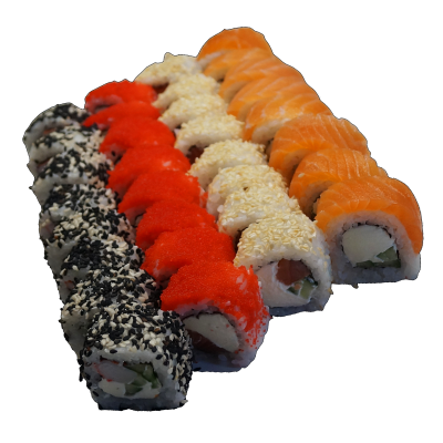 Philadelphia z łososiem na wierzchu, Philadelphia z łososiem w sezamie, Philadelphia z łososiem w kawiorze, California z surimi w sezamie